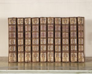 SAINT-EVREMOND. Œuvres. S.l., s.n., 1740. 10 vol. in-12, veau, dos à nerfs orné, p. de t. et de tom. rouges (Rel. ép.). 3 front. et 3 planches. Défauts. Mentions manuscrites sur les gardes.