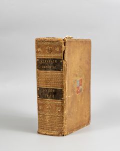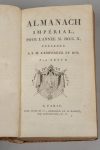ALMANACH IMPÉRIAL. Paris, Testu et Compagnie, 1810. Fort in-8, veau blond, roulettes en encadrement, armes dorées et peintes au centre des plats, dos lisse orné, pièces de titre noire, tr. noires (Rel. ép.). Exemplaire sur grand papier, dans une...