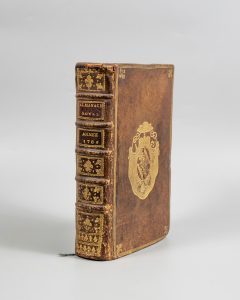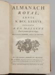ALMANACH ROYAL, année 1786. Paris, d'Houry, 1786. In-8, veau brun, triple filet, armes dorées, fleur de lys aux angles et au dos orné, gardes de papier gaufré doré, tr. dorées (Rel. ép.). Aux armes Rohan-Guéméné. OHR, proche de la pl. 2032,...