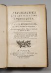 BACHER (Alexandre-Philippe). Recherches sur les maladies chroniques, particulièrement sur les hydropisies et sur les moyens de les guérir. Paris, veuve Thiboust, Didot, 1776. In-8, mar. bordeaux, triple filet, armes au centre, dos à nerfs orné,...