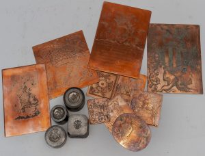 CUIVRES originaux pour ex-libris armoriés. 24 ex., formats divers, dont Fauconnier, Croix Croisilles, Camus, Brallet, Dorais… Joints 4 poids et un fer, frappés aux armoiries.