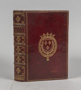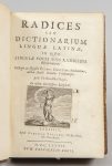 DANET (Pierre). Radices, seu dictionarium linguae, latinae... Paris, Pralard, 1677. In-8, mar. rouge, triple filet, armes dorées, dos à nerfs orné de fleurs de lys, tr. dorées (Rel. ép.). Aux armes de Louis XIV. OHR, pl. 2494, fer n° 5. Rel....