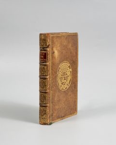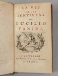 DURAN]. La Vie et les sentimens de Lucilio Vanini. Rotterdam, Gaspar Fritsch, 1797. In-12, veau, triple filet doré, armes dorées, dos à nerfs orné, p. de titre rouge, tr. rouges (Rel. ép.). Aux armes de Bellanger (?-1740), seigneur...