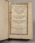 principal ouvrage, ont été reliés cinq autres écrits de Saint Jean Chrysostome, en grec et traduction latine pour certains, imprimés à Paris par Frédéric Morel en 1586 et 1594. Aux armes de Jean-Jacques Charron de Ménars (1643-1718) : conseiller au Parlement de Paris puis président à mortier, il "acquit vers 1679 la collection des de Thou qu'il vendit en 1706 au cardinal de Rohan, alors évêque de Strasbourg ; le reste de sa bibliothèque, qui était fort riche, fut vendue à La Haye après sa mort, à l'exception d'environ 850 manuscrits qui finirent par venir grossir le fonds de la Bibliothèque royale en 1755". OHR, pl. 185, proche du fer n° 1, d'un format plus petit. 3 ex-libris imprimés, dont Jacques Vieillard. Qq annotations et taches d'encre marginales, p. 399 restaurée en marge inf., qq rousseurs. Reliure lég. frottée, trous de vers aux mors fragilisant les charnières.