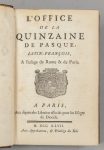 OFFICE de la quinzaine de Pâques, latin-français. Paris, aux dépens des libraires associés, 1747. In-8, mar. rouge, frise dorée en encadrement sur les plats, armes dorées et pièces armoriées aux angles, dos à nerfs orné avec pièces...