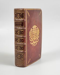 OFFICE DE LA SEMAINE SAINTE. Paris, Hérissant, 1772. In-12, mar. bordeaux, triple filet doré, fleuron aux angles, armes dorées, dos à nerfs orné, tr. dorées (Rel. ép.). Titre et frontispice gravés. Aux armes non identifiées. Manque à OHR....