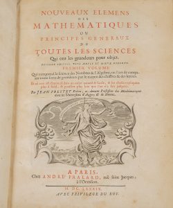 PRESTET (Jean). Nouveaux élémens des mathématiques ou Principes généraux de toutes les sciences qui ont les grandeurs pour objets. Paris, André Pralard, 1689. 2 vol. in-4, mar. rouge, triple filet doré, fer armorié aux angles, armes dorées,...