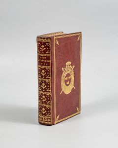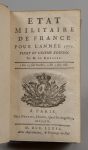 ROUSSEL. État militaire de la France pour l'année 1779. Paris, Onfroy, 1779. In-12, mar. rouge, triple filet et fleuron d'angle, armes dorées, dos lisse orné, doublure et gardes de papier dominoté, tr. dorées (Rel. ép.). Aux armes de...
