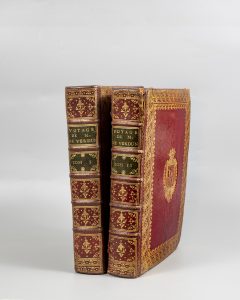 2 vol. in-4, mar. rouge, large dentelle dorée en encadrement, armes dorées, dos à nerfs orné, p. de t. et de tom. vertes, tr. rouges (Rel. ép.). I : [4]-389-[1]-XIX-[3], 28 pl. h.-t. dont 26 dépliantes ; II : [8]-500-XXXI pages, 3 très grandes cartes dépliantes sur vélin fort : Antilles, Mer du Nord, Océan Atlantique. Édition originale de cette relation de l'expédition dédiée à l'astronomie nautique et l'hydrographie : entreprise "Pour vérifier l'utilité de plusieurs Méthodes & Instrumens, servant à déterminer la Latitude & la Longitude, tant du Vaisseau que des Côtes, Isles & Ecueils qu'on reconnoît: Suivi de Recherches pour rectifier les cartes hydrographiques". Aux armes de Antoine de Sartine (1729-1801), comte d'Alby. "Lettré et bibliophile émérite, il avait rassemblé une très importante collection de livres qu'il faisait revêtir de magnifiques reliures". Provenance exceptionnelle pour cet ouvrage rare ; Sartine était alors Ministre de la Marine (1775-1780). OHR pl. 74, variante du fer. Ex-libris William Van Mildert. Rousseurs. Rel. frottée, mors fendus, un coin cassé.