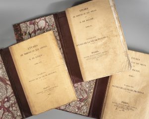 de relais : Tome I : couv. et titre datés 1835 - Tome II : couv. et titre datés 1835, avec mention "Troisième édition, entièrement refondue". - Tome III : couv. 1838, titre 1834 avec mention "Troisième édition, entièrement refondue" - Tome IV : couv. 1838, titre 1837. [Scènes de la vie de province. Tomes I et II : couv. et titre 1834 - Tomes III et IV : couv. et titre 1837. Scènes de la vie parisienne. Tomes I et IV : couv. et titre 1835 - Tomes II et III: couv. et titre 1834]. Rousseurs importantes à certains volumes, couv. salies avec manques ou déchirures.