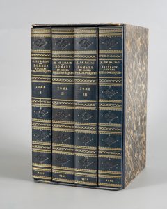 BALZAC. Romans et contes philosophiques. Troisième édition. Paris, Charles Gosselin, 1831. 3 vol. — Nouveaux contes philosophiques. Second tirage. Ibid., id., 1832. — 4 vol. in-8, brochés, chemises demi-mar. bleue ornées or et à froid,...