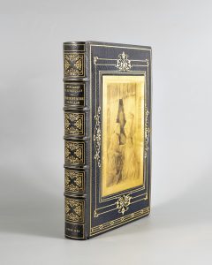 BARBEY D'AUREVILLY. Une histoire sans nom. Paris, Société des médecins bibliophiles, 1922. In-4, mar. bleu, plaque de cuivre enchâssée sur le premier plat (illustration p. 83) et encadrée de filets dorés et palmes, dos à nerfs orné, tr....