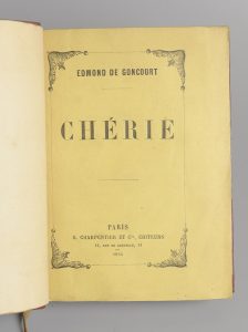 GONCOURT (Edmond). Chérie. Paris, Charpentier, 1884. In-12, demi-mar. rouge à coins, dos à nerfs orné, tête dorée, couv. cons. (Pouillet). Édition originale rare. Un des 100 ex. sur Hollande, à grandes marges. Ex-libris Dr E. Olivier.