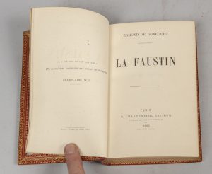 GONCOURT (Jules). La Faustin. Paris, Charpentier, 1882. In-12, mar. rouge, monogramme doré, dos à nerfs, dentelle int., tête dorée,couv. cons. (Chambolle-Duru). Édition originale rare. Un des 175 ex. sur Hollande, bien relié. Ex-libris Dr E....