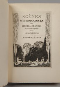 REGNIER (Henri de). Scènes mythologiques. Paris, Le Livre, 1924. In-8, demi-mar. gris à coins, dos à nerfs, tête dorée, couv. cons. (Kauffmann-Horcroix). Ill. de 40 eaux-fortes d’André Marty. Un des 300 ex. num. sur vergé de Hollande. Dos...