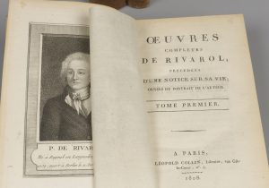 RIVAROL. Œuvres complètes. Paris, Collin, 1808. 5 tomes en 3 vol. in-8, demi-basane fauve, dos lisses ornés (Rel. ép.). Portrait-frontispice. Qq rousseurs. Dos et coiffes frottés.