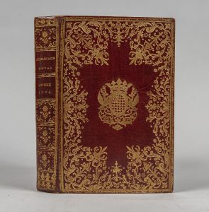 ALMANACH ROYAL. Paris, Le Breton, 1774. In-8, mar. rouge, large dentelle dorée, armes au centre, dos lisse orné, doublure et gardes de soie bleue, tr. dorées (Rel. ép.). Très bel exemplaire, aux armes de Chrétien-Guillaume de Lamoignon de...