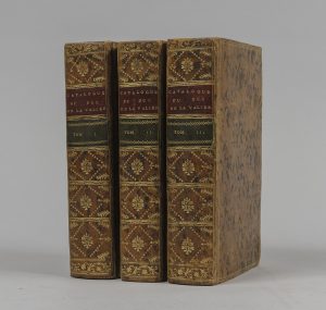 BURE (Guillaume de). Catalogue des livres de la bibliothèque de feu M. le duc de La Vallière. Paris, Guillaume de Bure fils aîné, 1783. 3 vol. in-8, veau marbré, triple filet, dos lisse orné, p. de t. bordeaux et de tom. verte, tr. mouchetées...