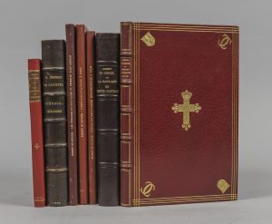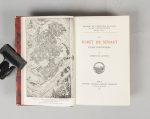 du Bulletin du bibliophile, tiré à 150 ex. Ex-libris "Archives et Bibliothèque du Port Courcel". Joints : -CHODRON DE COURCEL (Robert). Vigneux sur Seine. Étude historique. Évreux, Hérissey, 1928. In-8, demi-mar. brun de l'ép. Tirage à 550 ex. -COURCEL (Baron de). Notice sur la vie et les travaux de M. Louis Buffet. Paris, Renouard, 1902. In-8, demi-percaline rouge de l'ép. Envoi a.s. de l'auteur. -COURCEL (Robert de). Les Demeures diplomatiques du Faubourg St Germain. Paris, 1938. In-8, demi-mar. brun à coins de l'ép. Tirage à 25 ex. -COURCEL (Robert de). L'Ambassade d'Autriche à Paris. Paris, 1940. In-8, demi-mar. rouge à coins de l'ép. -COURCEL (Robert de). L'Hôtel des ambassadeurs extraordinaires à Paris. Paris, 1940. In-8, demi-mar. rouge à coins de l'ép. -COURCEL (Robert de). La Basilique de Sainte Clotilde. Paris, 1957. In-8, demi-mar. brun à coins de l'ép. 1-25 ex. de tête sur pur fil. Envoi a. s. "RC". -COURCEL (Robert de). La Forêt de Sénart. Paris, Champion, 1930. In-8, demi-mar. bordeaux de l'ép. 1-25 ex. sur Arches hors commerce. Envoi a. s. "RC" : "à ma chère Jeanne, souvenir du Port-Courcel (...)" Ens. 8 vol.