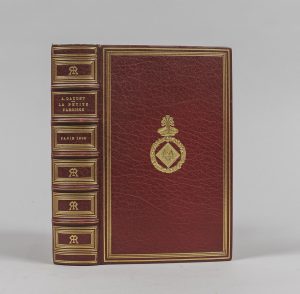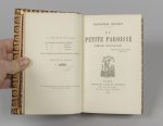DAUDET. La Petite paroisse. Paris, Lemerre, 1895. In-12, maroquin rouge, quadruple filet doré, armes dorées, dos à nerfs orné du chiffre 2 R adossés, dentelle dorée int. ornée de palmettes et hiboux, couv. et dos cons., tr. dorées (Lortic)....
