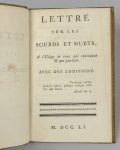 DIDEROT]. Lettre sur les sourds et muets. 1751. Petit in-8, (2), 141 pp., (1) p. d'errata, (3) ff. de table, 3 planches, mar. rouge, triple filet, dos lisse orné, tr. dorées, roulette int. (Rel. ép.). Troisième édition, parue à la date de...