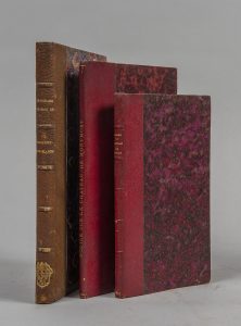 bordeaux, tête dorée. Qq rouss. -CARRO. Notices sur le château de Meaux et sur le cabinet de Bossuet. Paris, Ledoyen, 1853. In-12, demi-mar. rouge, dos à nerfs. Ill. de 8 planches dont une dépliante.