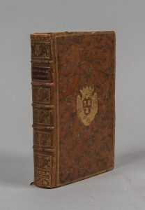 marquise de Pompadour (1721-1764), maîtresse de Louis XV, elle "protégea les arts et les lettres et fonda la manufacture de Sèvres (...). Elle s'était formé une collection très considérable d'environ 4000 volumes dans tous les genres, la plupart reliés à ses armes par Padeloup, Derôme et autres"". OHR, pl. 2399, proche d fer n° 4 (format plus petit). Rel. frottée, coiffe sup. abîmée. Infimes rousseurs.