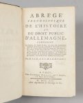 PFEFFEL]. Abrégé chronologique de l'histoire et du droit public d'Allemagne. Paris, Hérissant, 1754. In-12, veau, triple filet doré, armes dorées, dos à nerfs orné, p. de t. rouge (Rel. ép.). Exemplaire aux armes de Jeanne-Antoinette Poisson,...