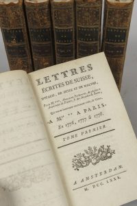 PLATIÈRE (Roland de La)]. Lettres écrites de Suisse, d'Italie, de Sicile et de Malte. Amsterdam, 1780. 6 vol. in-12, veau marbré, dos lisse orné, p. de t. noires et de tom. vertes, tr. marbrées (Rel. ép.). Édition originale. Ex-libris Grimod...