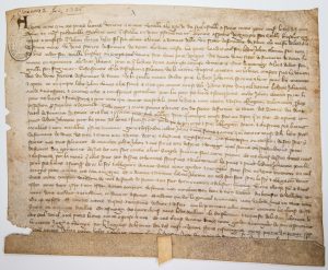 - DEUX-SÈVRES. 1346. Retrait d'une rente de blé froment par Jean Clavea, valet, sur Johanne Assonne de Guerpie, Veuve de Guillaume Breschet. SAINT-MAIXENT, Février 1347. Vélin (21 x 26 cm). Texte en français.