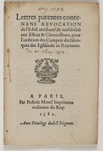 - PARIS 1582. CLERK - "Letters Patent containing Revocation of the Edict Attributing Jurisdiction to the Elected Officials and Controllers (Esleuz & Cotrerolleurs), for the hearing of the Accounts of the Fabriques of the Churches of this Kingdom" - of May 21, 1582 - (in PARIS by Frédéric Morel Imprimeur ordinaire du Roy. 1582; 8pp in-8°. Vignette.