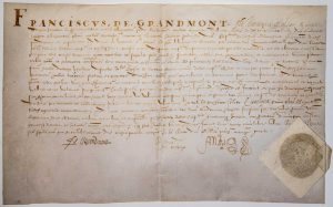 - FRANCHE-COMTÉ. 1584. DOUBS. JURA. Piece signed, on vellum, by François de GRANDMONT, Priest, Grand Doyen of the Diocese of BESANÇON. Besançon on July 24th, 1584. (19,5 x 32 cm), Seal under paper with arms, text in Latin. Appointment of Louis SANGET, Priest to the Diocese of Besançon to a vacant chapel in the church of ANNOIRE (Jura) by Jean Guillemin at the presentation of Louise de LA TOUR.