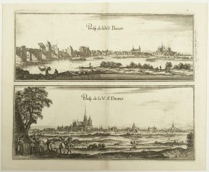 - YVELINES. City of POISSY (78) & City of ST DENIS (93). Merian (C. 1650). Engraving (31 x 38 cm) of 2 views of the cities. Fold.