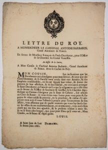 - AVIGNON COMTAT. 1660. LETTER FROM THE KING (LOUIS XIV), to Monsignor Cardinal Antoine BARBARIN, Grand Chaplain of France. Done at SAINT-JEAN-DE-LUZ (64) on June 12, 1660. 1 printed page (32.5 x 23 cm). Royal coat of arms header. He asks him to support the request of Mr DECOHORNE in the interest that the resignation he made in his favour of the Office of Secretary & Clerk of the Apostolic Chamber of the Comtat d'Avignon by Mr de CABANIS, be admitted to the Court of Rome.