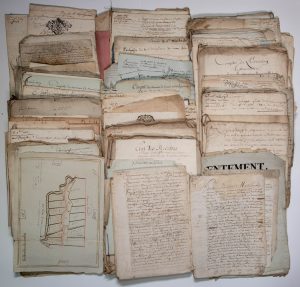LEGRAND Négociant à REIMS et Mathieu de VIENNE Conseiller en la Cour de Metz. Principalement liée aux terres du Hameau CONFLANS (51) dépendant de VILLESENEUX (51) et pièces concernant Ste Ménéhould, Épernay, Germinon, Vienne Le Château, Ay et Reims (Comptes, testaments, inventaires, plans manuscrits, vente d'un bien national, tutelle, baux, partage et un journal de voyage, etc.)