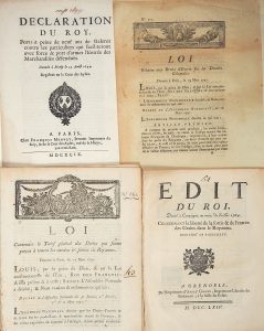 à PARIS, chez François MUGUET, Premier Imprimeur du Roy, & de la Cour des Aydes, rue de la Harpe, aux trois Rois. 1699 - Vignette royale - Impr. 3pp in-folio + «Édit du Roi, donné à Compiègne au mois de Juillet 1764, concernant la liberté de la sortie & de l'entrée des Grains dans le royaume.» - Impr. à Grenoble, chez André GIROUD; 6pp in-4° + «LOI contenant le TARIF GÉNÉRAL des Droits qui seront perçus à toutes les entrées & sorties du royaume. Données à Paris le 15 mars 1791.» N°661. Impr. à PARIS, de l'Imprimerie royale, 1791. 44pp in-4° - (Liste de toutes les denrées avec leurs droits de douanes.) + «LOI relative aux droits d'Entrée sur les DENRÉES COLONIALES» Donnée à Paris le 29 mars 1791. (Sucres, café, cacao, indigo... Cayenne, Saint Domingue, Martinique...) - Impr. à Nîmes, chez C. Belle, Imprimeur du roi et du Département du Gard, 171; Impr. 5pp in-4°.