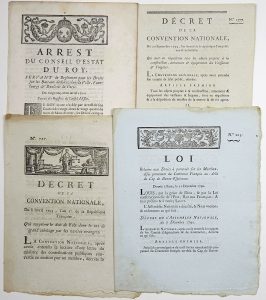 différents abus qui se commettent aux Déchirages des Bateaux dans tous les Ports, d'Amont & d'Aval, BOSSE-DE-MARNE, PORT-À-LANGLOIS, SÈVRE & autres...Fait défense Sa Majesté à tous Déchireurs de Bateaux & à tous autres d'en Déchirer aucun, sans en avoir au préalable fait déclaration au Bureau dudit GIRARD, & en avoir obtenu la permission par écrit, faisant mention du paiement des Droits, à peine de confiscation des Bateaux Déchirés ou des Bois qui en feront provenus...” - Impr. 3pp in-4° + «Loi relative aux Droits à percevoir sur les Marchandises provenant du Commerce Français au-delà du Cap de Bonne-Espérance.» - du 12 Décembre 1790. N°203. - Impr. au MANS, chez De Pivron; 3pp in-4° + Décret de la Convention Nationale du 20 septembre 1793, qui met en réquisition tous les objets propres à la construction, armement & équipement des Vaisseaux & frégates.» (liste des marchandises.)- N° 1577 - Impr. à Paris, de l'Impr. du Louvre. Griffe de GOHIER et cachet rouge de la République: 4pp in-4° + «Décret de la Convention Nationale du 8 avril 1793, qui supprime le droit de frêt dans le cas de grand cabotage par les navires étrangers.» N° 727 - Impr. à Nîmes, chez C. Belle; 3pp in-4°.