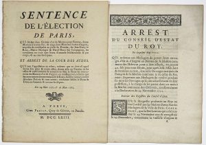 dit Essais faits & reconnus au titre, être les dits Ouvrages marqués du Poinçon de la Maison commune & de celui du Fermier: Et permet aux Horlogers de vendre pendant six mois les ouvrages qu'ils ont actuellement en leur possession, à la charge de les porter dans un mois à la Maison commune des Orfèvres, conformément à la Déclaration du 23 novembre 1721 - Imp. de 8pp in 4 avec bandeau - Du 5 mai 1722 + “SENTENCE de l'Élection de PARIS, qui déclare 2 Chaînes d'or de Montres de Femme, 12 Montres à boëtes d'or, & 22 Montres à boëtes d'argent, acquises & confisquées au profit du Fermier, sur Jean FURCY LE ROUX, Maîtres HORLOGER & David DROTZ son Compagnon, les condamne en trois cents livres d'amende solidairement & par corps, & en tous les dépens. Et ARREST de la Cour des Aydes. Qui met l'appellation au néant, ordonne que ce dont est appel sortira son plein et entier effet; donne acte au Fermier de ses offres & consentements de remettre au Sieur le ROUX les mouvements des Montres d'or et d'argent; en conséquence, ordonne que les mouvements seront remis audit le Roux, sauf son recours contre Abraham DUBOIS & tous autres; condamne lesdits le ROUX & DROTZ en l'amende & en tous les dépens.” - des 24 Mars 1762 & 18 Mars 1763 - Impr. à PARIS, chez PRAULT, Quai de Gêvres, au Paradis, 1763, 9pp in-4°.