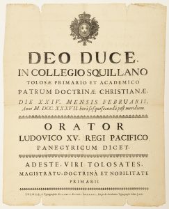 - HAUTE-GARONNE. 1737. Avis du Collège SQUILLANO de TOULOUSE, sous l'autorité du Roi Louis XV. 24 Février 1737. Texte en latin.