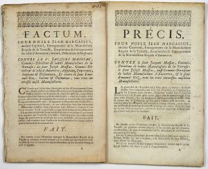 - (HAUTE-GARONNE.) 2 Imprimés de procès (vers 1739.): FACTUM et PRÉCIS, «pour Noble Jean MARCASSUS Ancien Capitoul, entrepreneur de la Manufacture royale de LA TERRASSE, Propriétaire et Entrepreneur de celle D'AUTERIVE, intimé, Contre le Sieur...