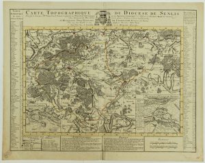 - "MAP XVIII of L'OISE: "Topographical map of the Diocese of SENLIS raised on the spot by M. PARENT Curé d'AUMONT, and subjected to astronomical observations and geometrical operations of Gentlemen of the Royal Academy of Sciences. By Guillaume De l'ISLE first Geographer of the King. Dedicated to Monsignor Jean François de CHAMILLARD Bishop of SENLIS. Printed in Amsterdam at J. Covens and C. Mortar, Geographers. Alphabetical table of places in the Diocese of Senlis; Betancourt, Chantilly, Ermenonville... With in cartridges, "le Plan de la Ville de SENLIS" and "le Plan de CRESPY" Variant, the Warning is in French and Dutch.