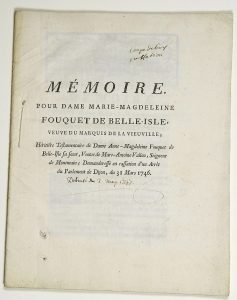 - (FOUCQUET DE BELLE-ISLE) "Memory for Lady Marie-Magdeleine FOUQUET DE BELLE-ISLE, widow of the Marquis de LA VIEUVILLE; Testamentary heiress of Lady Anne-Magdeleine Fouquet de Belle-Isle her sister, Widow of Marc-Antoine VALLON, Lord of MONTMAIN; Plaintiff in cassation of a Judgment of the Parliament of DIJON, March 31, 1746." - Impr. 24pp in-4°.