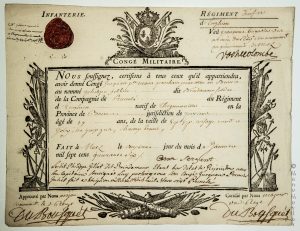 - ENGHIEN INFANTRY REGIMENT. Military leave named Philippe GILBERT Dit Brindamour Soldier of the Company of PRUNÉLÉ native of THIGNONVILLE (45). Done in METZ (57) 2 January 1746 - Exhibit signed by the Council of the Regiment & de ROCHECOLOMBE Brigadier of the Armies of the King, His Commander in the Government of METZ. 1p in-folio oblong, decorated with weapons - Wax stamp of the Regiment.