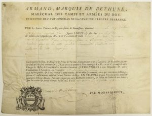 - Armand Louis 1er de BÉTHUNE (1711-1788) Marquis de Béthune et de Chabris, Colonel-General (Cavalry). Coin signed Armand, the Marquis de Béthune, Marshal of the Camps and Armies of the King, and Mestre de Camp General of the Light Cavalry of France. (Heading and Stamp with his arms engraved) - Made in PARIS on July 17th 1751. Letters Patent of the King and Commission made on July 12, 1743 for Sieur de SAVIÉ, cydevant Cornette Captain of a Company in the Regiment of ESCARS CAVALERIE for in the said capacity Commander To lead and exploit the said Company, under the authority of the King, Mr. Prince de TURENNE Colonel General of the Cavalry and ours. Vellum (24.5 x 32 cm)