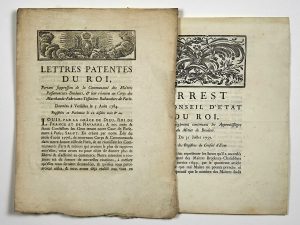 l'Imprimerie Royale; 3pp in-4° - «Nul Maître ne pourra prendre ni obliger aucun apprenti que le nombre des Maîtres dudit métier ne soit réduit & diminué à celui de 200..» (pour réguler le nombre de Maitre Brodeur-chasublier) + (CORPORATION des PASSEMENTIERS-BRODEURS.) “Lettres Patentes du roi, portant suppression de la Communauté des Maîtres Passementiers-Brodeurs, & leur réunion au Corps des Marchands-Fabricants, Tissutiers-Rubaniers de PARIS. - Données à VERSAILLES (78) le 5 Août 1784 - Impr. à Paris, 4pp in-4°, Bandeau.