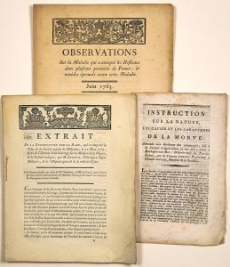 - ANIMAL DISEASE. 3 Printed matter: "Observations on the disease that has attacked Livestock in several provinces of France; & proven remedies against this Disease. June, 1763." - Printed in Paris, by the Royal Printing Office. 1763; 7pp in-4° - Bandeau - "... it manifested itself almost at the same time & in the same manner in Limousin, Poitou, the country of Aunis, Bourbonnais, Touraine & Berri; Orleans & Champagne were infected later: It is learned that the cattle of Lorraine, the country of Messin & Haynault, bordering the country of Luxembourg & the Ardennes, are attacked by the same disease...". (Description of the disease, cure and remedy, Lotion, Drink, Perfume, etc.) + (LA RAGE & LA MORSURE DE LA VIPÈRE) - "Extract from the Dissertation on Rabies, which won the Prize of the Royal Society of Medicine, on March 11, 1783, followed by the Extract from a work on the Bite of the Viper, & the Malignant Pustule, by M. LEROUX, Military Surgeon Major, & of the General Hospital of the City of DIJON. (21)" - Impr. 12pp in-4°, in DIJON, from the Printing Office of J.B. CAPEL, Printer of the Bishop, of the Command & Stewardship. 1785 - "the said Extract addressed, by order of the Bursar, to Messrs. The Parish Priests, to be, by them, given communication to the Inhabitants, & sent copies to the Doctors & Surgeons of their Parishes". + (PAS-DE-CALAIS. MORVE DISEASE) - "INSTRUCTION on the nature, causes and characteristics of MORVE: Addressed to the inhabitants of the countryside; read to the Society of Agriculture and the Arts, at BOULOGNE-SUR-MER, Pas-de-Calais Department, by the citizen LEBAS, Professor at the Central School, Member of the Society." - Platelet printed 8pp in-8°, in Paris, from the Imprimerie de la feuille du Cultivateur, rue des Fossés-Victor, n°12- l'An 7 (1799)