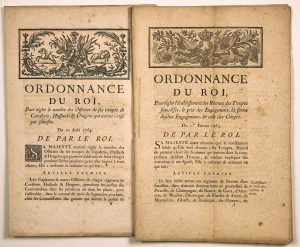 - ARMÉE DE LOUIS XV. 2 printed: "Ordonnance du Roi, pour régler l'établissement des Recruits des Troupes Françaises, le prix des Engagements, la forme desdits Engagements, & celle des Congés" of February 1st 1763 - In Paris, from the Imprimerie Royale. 1763; 30pp in-folio + "Ordinance of the King, to regulate the number of Officers of his Cavalry Troops, Hussars & Dragons who will have leave per semester" of August 10, 1764 - In Paris, from the Royal Printing Office. 1764; 8pp in-folio.