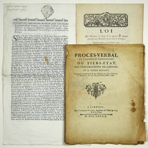 la Généralité de LIMOGES. 1766; Imprimé timbré, 4pp gd in-folio + «Procès-Verbal de l'assemblée particulière du TIERS-ÉTAT, des Sénéchaussées de LIMOGES et de St YRIEIX Réunies. Contenant la nomination de leurs Députés aux États-Généraux & Suppléants, des 17, 18, 19, 20, & 21 Mars 1789.» Impr. à LIMOGES, chez Jacques FARNE, Imprimeur de l'Hôtel de Ville & de la Police. 1789; 15pp in-4° + “LOI qui détermine la forme & la quotité des Secours accordés aux incendiés de la Ville de LIMOGES.” - Données à Paris le 31 Octobre 1790 - Bandeau - Impr. à Paris, 3pp in-4°.