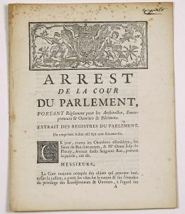rue de la Harpe, à l'Hercule. 1766; 6pp in-4°. «La Cour a porté ses vues sur la nature & sur l'étendue du privilège des Entrepreneurs & Ouvriers, à l'égard des bâtiments qu'ils édifient, qu'ils reconstruisent ou qu'ils réparent...»