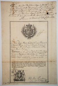 - (SWISS REGIMENT) CHOISEUL (Louis-Marie-Gabriel César, Baron de) Mestre de Camp de Cavalerie, Capitaine des Gendarmes de Mr le Dauphin et Ambassadeur du Roy près le Roy de Sardaigne (Son-En-tête imp.) - Piece signed CHOISEUL Ambassador at the bottom of a Life Certificate for Sieur DE LA RIVE, Citizen of GENEVA, Lieutenant and Major's Aide to the Swiss Regiment of Tatio in the service of H.M. the King of SARDINIA above in garrison in SUZE, currently in garrison in TURIN- TURIN 3 January 1769 - 1p (30 x 45). 2 Large royal vignettes and his coat of arms.